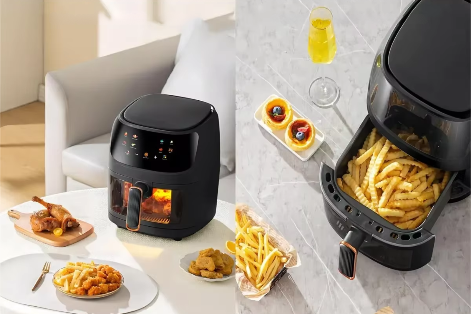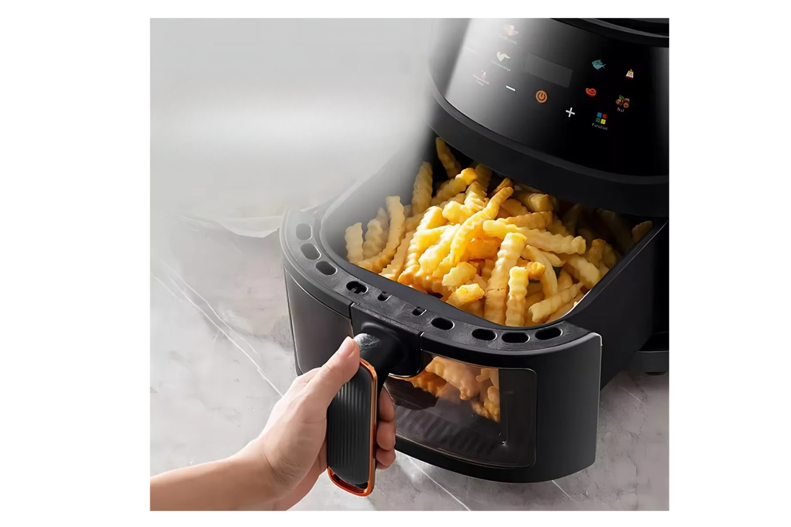 Frytkownica wyposażona jest w dotykowy ekran LED z intuicyjnym panelem sterowania oraz przezroczyste okienko, które umożliwia kontrolę procesu pieczenia bez konieczności otwierania urządzenia. Wykonana z wysokiej jakości, bezpiecznych dla zdrowia materiałów, 100% BPA free i bezzapachowych, gwarantuje komfort i pewność użytkowania.