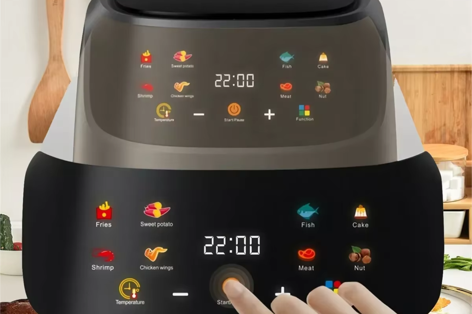 Frytkownica oferuje aż 8 trybów pracy – smażenie, pieczenie, grillowanie czy suszenie. Z jej pomocą przygotujesz frytki, kurczaka, steki, ryby, pizzę i wiele innych potraw, redukując zawartość tłuszczu nawet o 80%, a jednocześnie zachowując ich wyjątkowy smak.